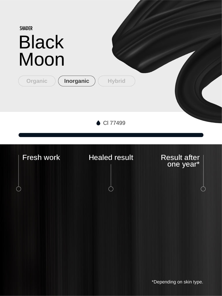 Black Moon es un pigmento shader negro inorgánico de nuestra colección PMU Mixer, que sirve como una herramienta esencial para los profesionales que buscan ajustar y profundizar los tonos de otros pigmentos. Como un color de mezcla fundamental en la paleta de cualquier artista PMU, su naturaleza inorgánica garantiza estabilidad y seguridad en una variedad de aplicaciones PMU.